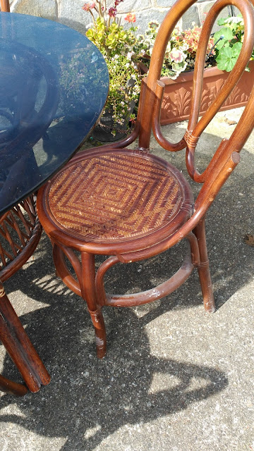 Conjunto de mesa de bambú y cristal con cuatro sillas a juego.